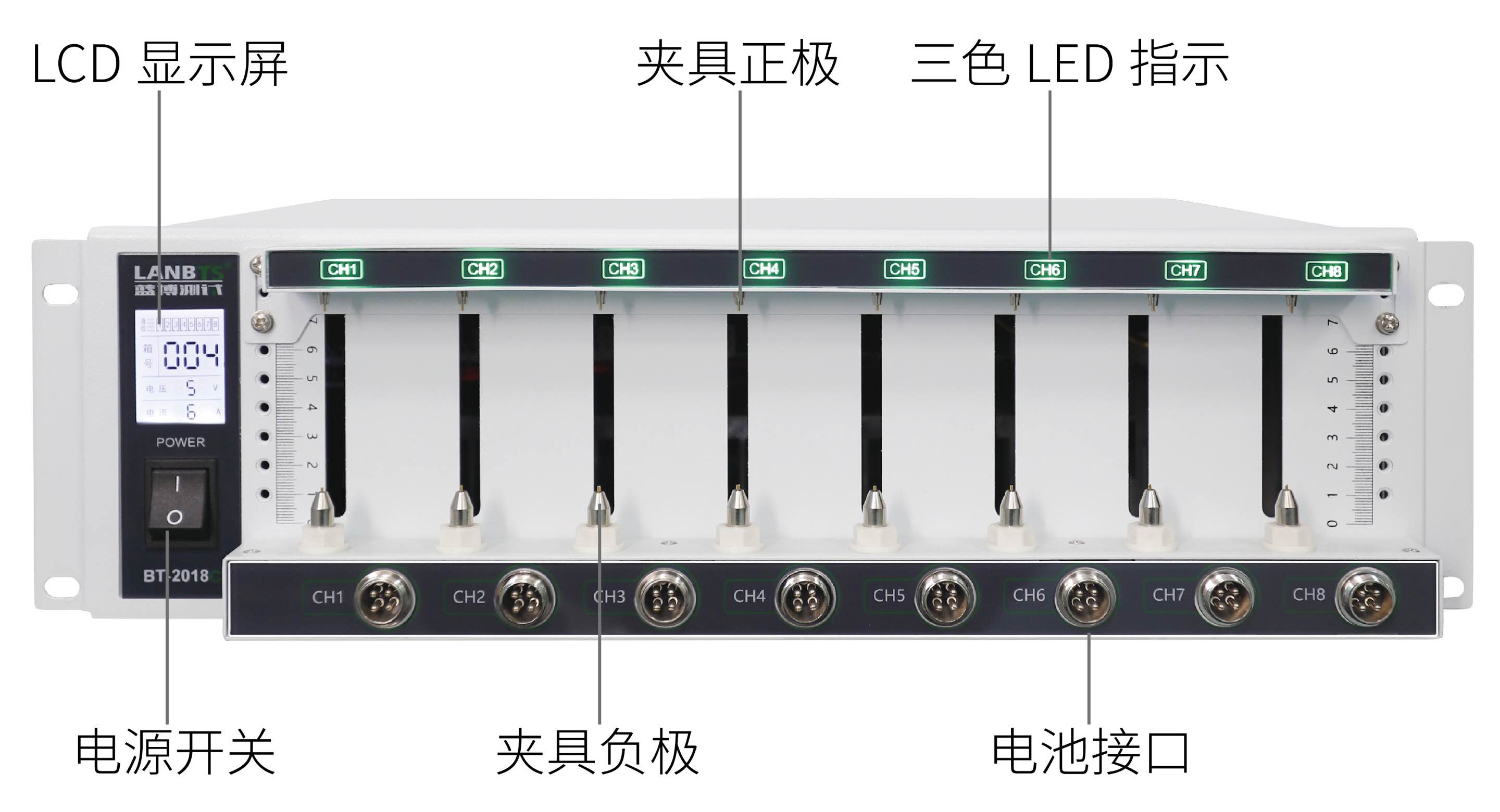 1、前面板既有四線制頂針夾具,也有航空插頭,兩種接口的應(yīng)用能滿足絕大部份電池的接入測試;